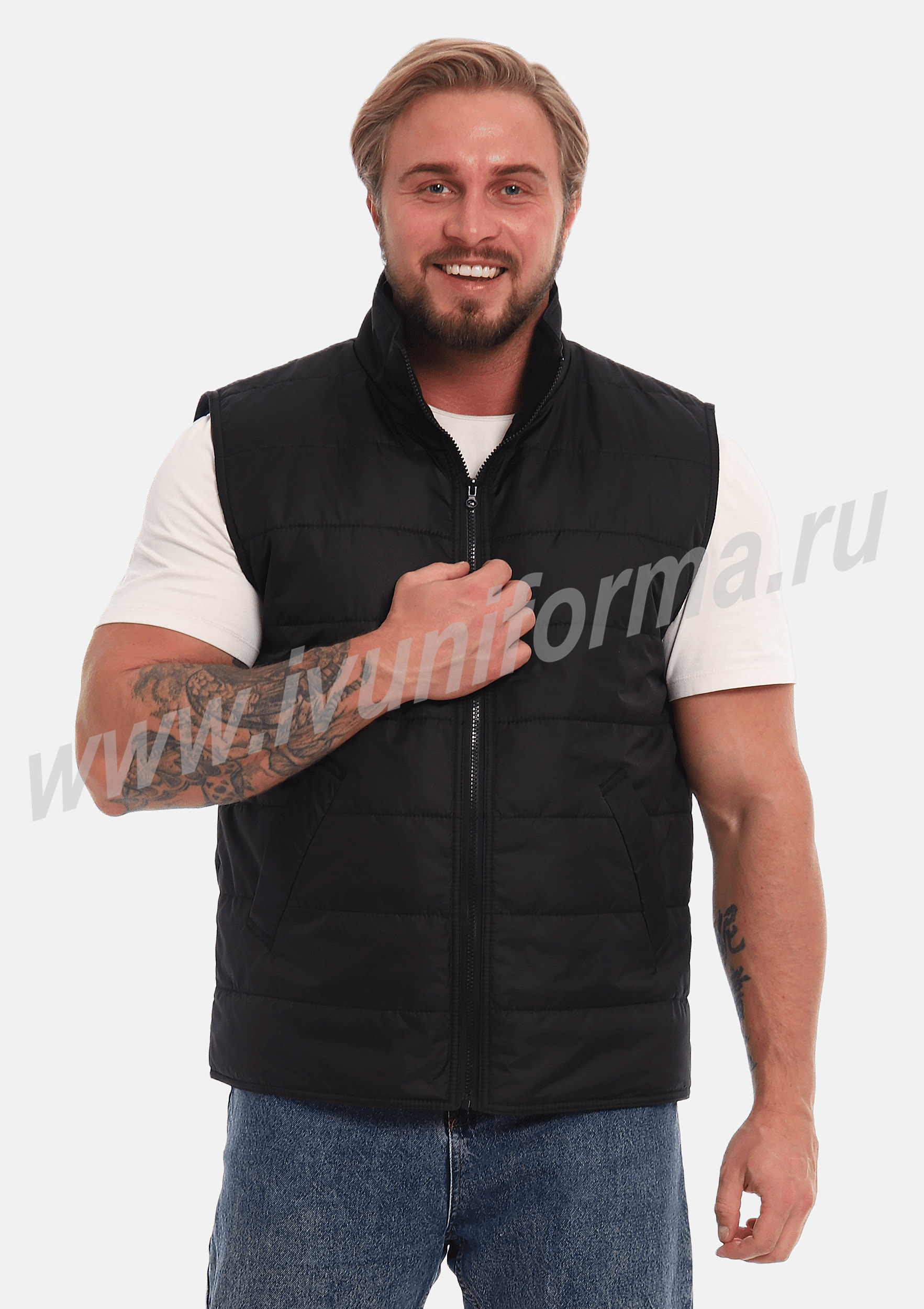 Жилет утепленный на молнии с двумя боковыми карманами в нижней части. Внутренняя часть жилета выполнена из ткани флис. В качестве утеплителя используется синтепон. Жилет является универсальным для использования как мужчинам, так и женщинам.